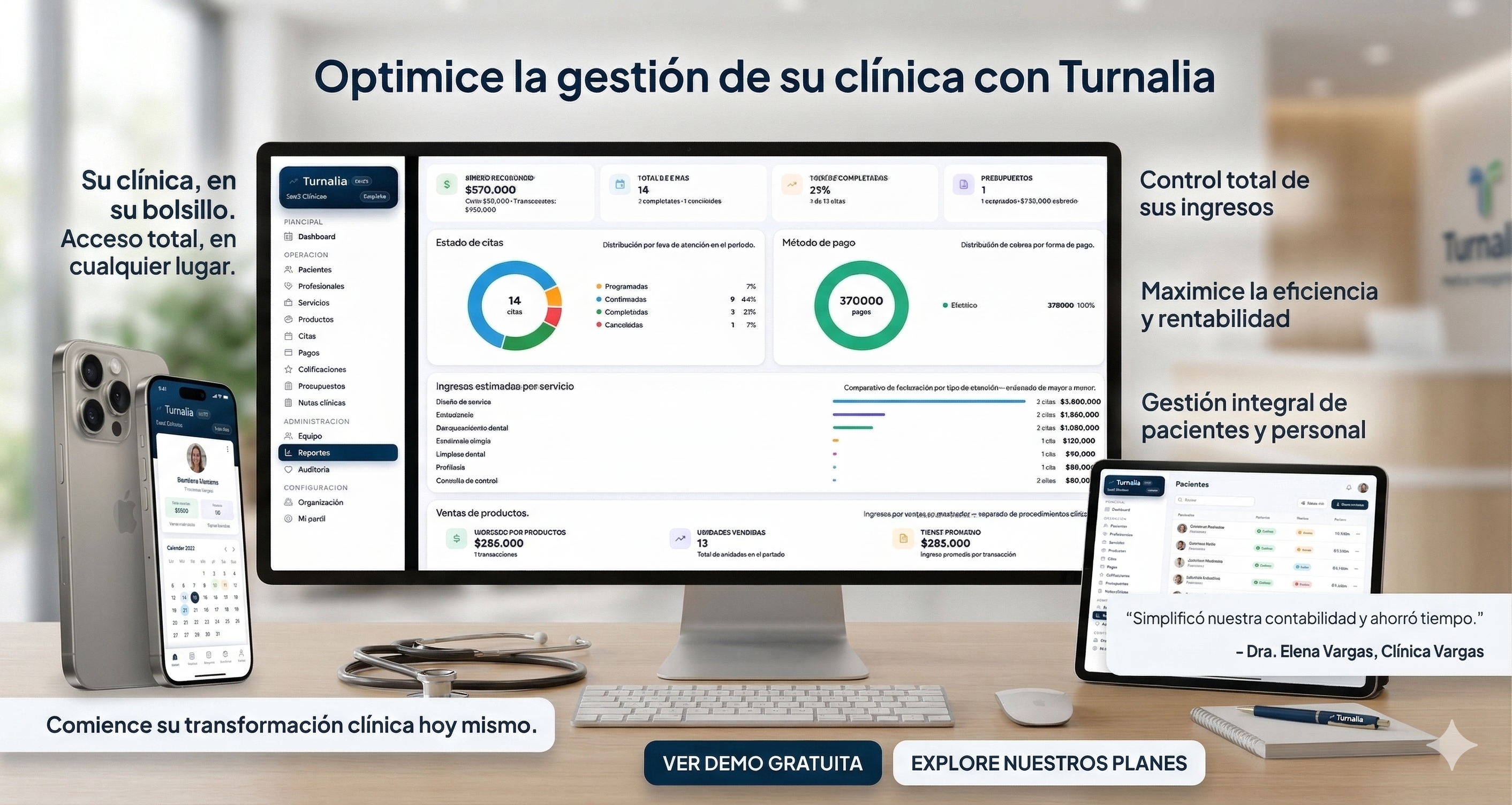 Agenda, pacientes, pagos y seguimiento en un solo panel. Tu equipo siempre alineado.